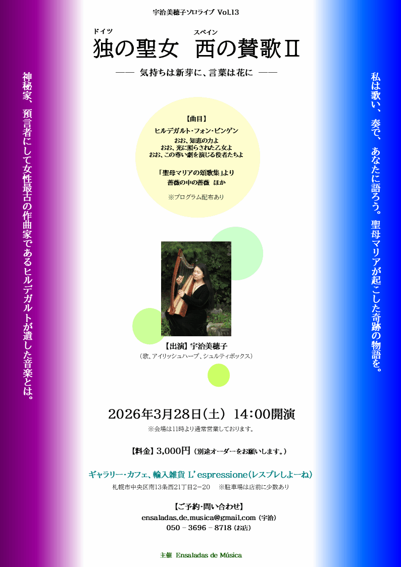 出演:宇治美穂子(歌、アイリッシュ・ハープ、シュルティ・ボックス)